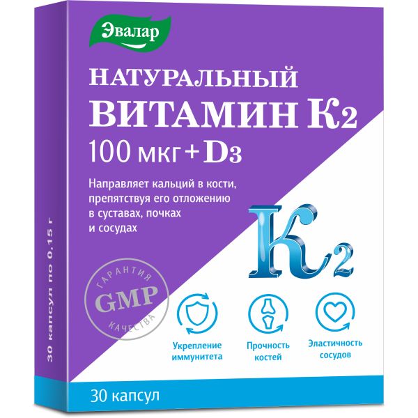 Натуральный витамин К2 100мкг+Д3 Эвалар капсулы 0,15г 30шт