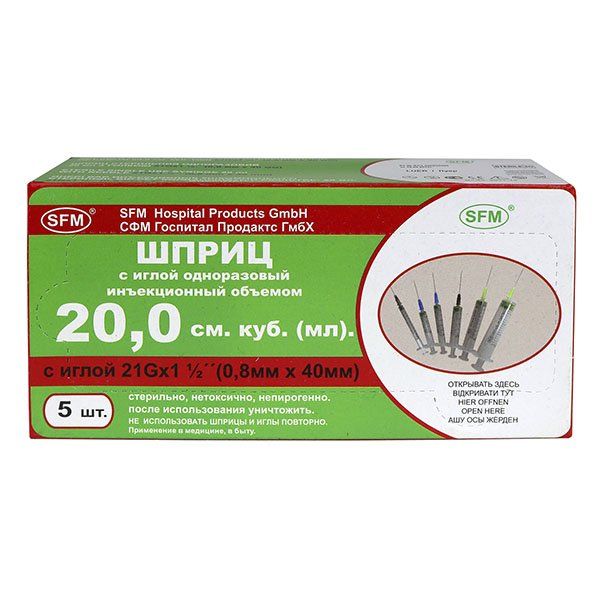 Шприц SFM Hospital (СФМ Госпиталь) 3-х компонентный 20 мл 0,8x40 мм 5 шт.
