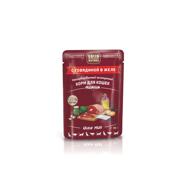 Корм влажный для кошек кусочки в желе с говядиной Premium Solid Natura пауч 85г