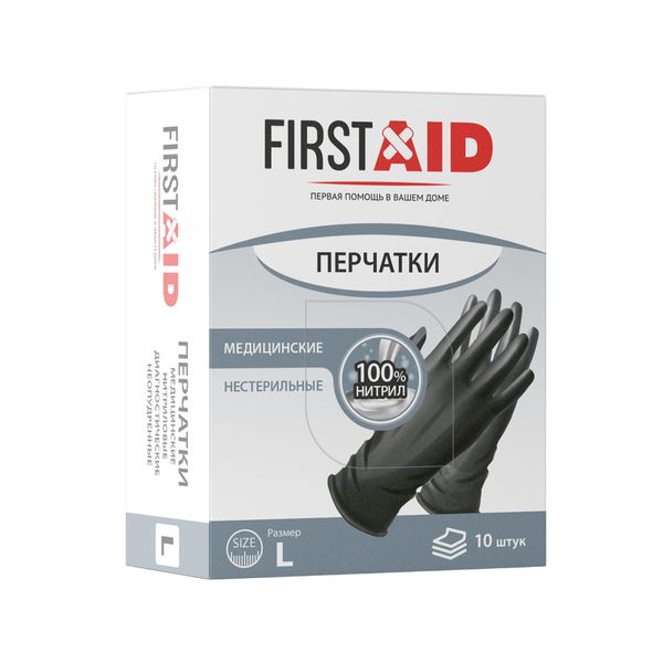Перчатки диагностические нитриловые неопудренные нестерильные черный First Aid/Ферстэйд 10шт р.L