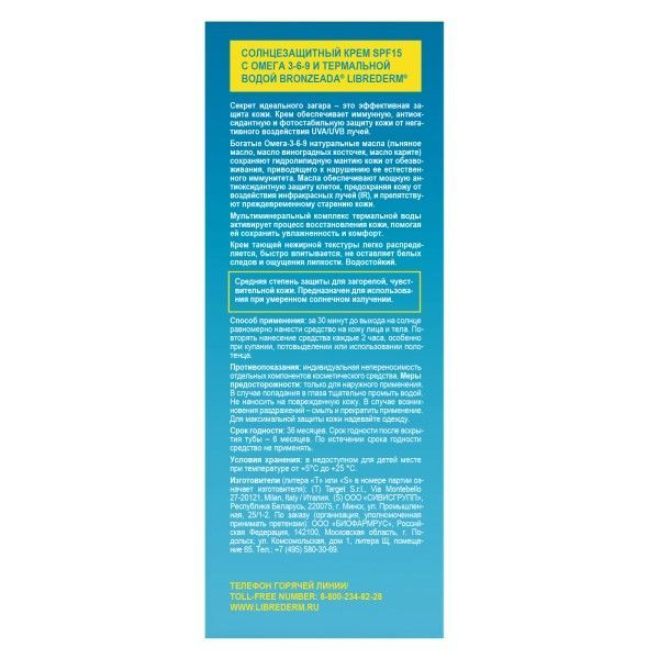 Крем солнцезащитный с омега 3-6-9 и термальной водой Librederm/Либридерм Bronzeada SPF15 150мл