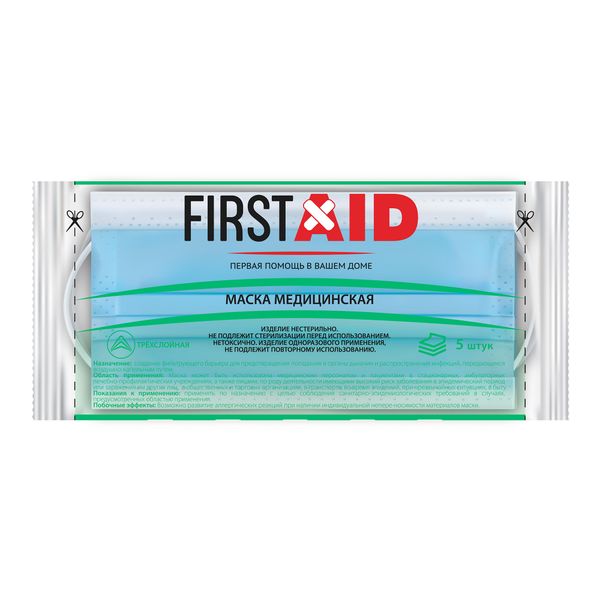 Маска медицинская трехслойная одноразовая с логотипом 9,5*17,5 см First Aid/Ферстэйд 5шт