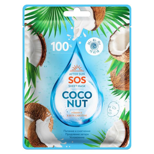 Маска тканевая для лица после солнца успокаивающая 100% SOS Coconut Mi-ri-ne/Ми-ри-не 22г