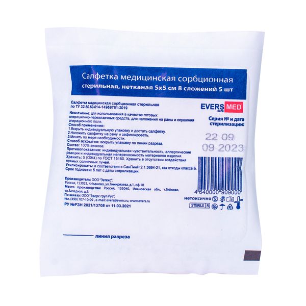 Салфетка медицинская нетканая сорбционная стерильная 8 сложений EversMed/ЭверсМед 5х5см 5шт