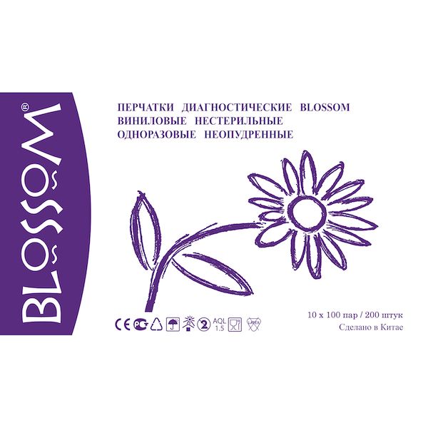 Перчатки диагностические виниловые неопудренные нестерильные Blossom 200шт (100 пар)