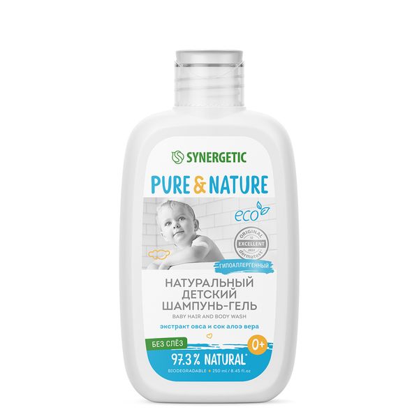 Шампунь-гель для волос и тела без слез натуральный гипоаллергенный детский 0+ Synergetic 250мл