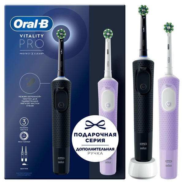 Щетка зубная электрическая 3708 с зарядным устройством 3757 черная 1шт+сиреневая 1шт Vitality Pro D103.423.3H Oral-B/Орал-би