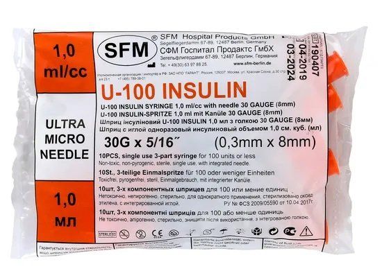 Шприц с иглой одноразовый инсулиновый SFM U-100 30G 0,3мм x 8мм 1мл 10шт
