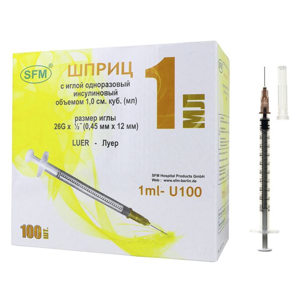 Шприц инсулиновый 3-х компонентный с иглой 26G U-100 SFM 0,45х12мм 1мл 100шт