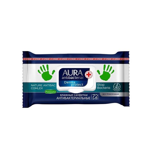 Салфетки влажные антибактериальные ромашка с крышкой Derma Protect Aura/Аура 72шт
