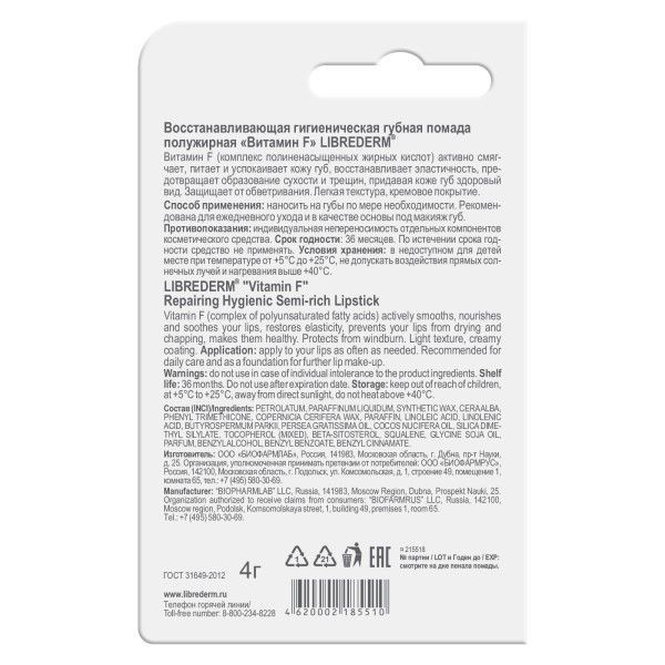 Помада гигиеническая восстанавливающая полужирная Витамин F Librederm/Либридерм 4г
