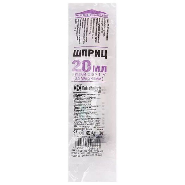 "Шприц стерил. инъекц. однокр.прим. 20 мл с прилож.иглой 21g 1 1/2"" (0,8мм x 40мм) sf 50шт"