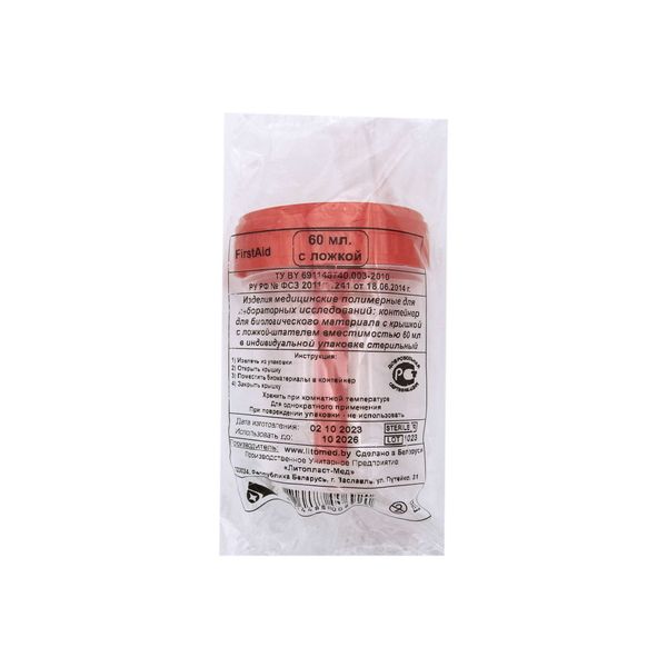 Контейнер для сбора биоматериала с крышкой и ложкой First Aid/Ферстэйд 60мл