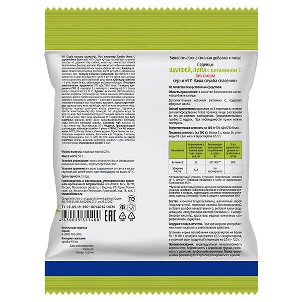 Шалфей, липа с витамином С без сахара 911 Ваша служба спасения леденцы 2,5г пак. 50г