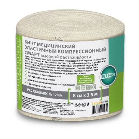 Бинт эластичный компресионный высокой растяжимости с 2-мя фиксаторами Интекс-Смарт Клинса 8см х 3,5м