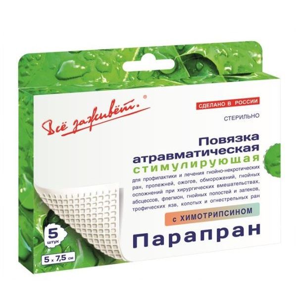 Повязка атравматическая стимулирующая стерильная с химотрипсином Парапран 5х7,5см 5шт