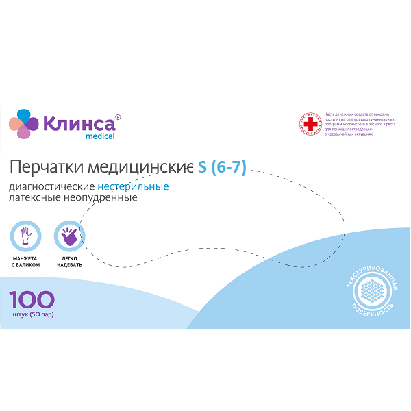 Перчатки диагностические латексные неопудренные Клинса 100шт р.S