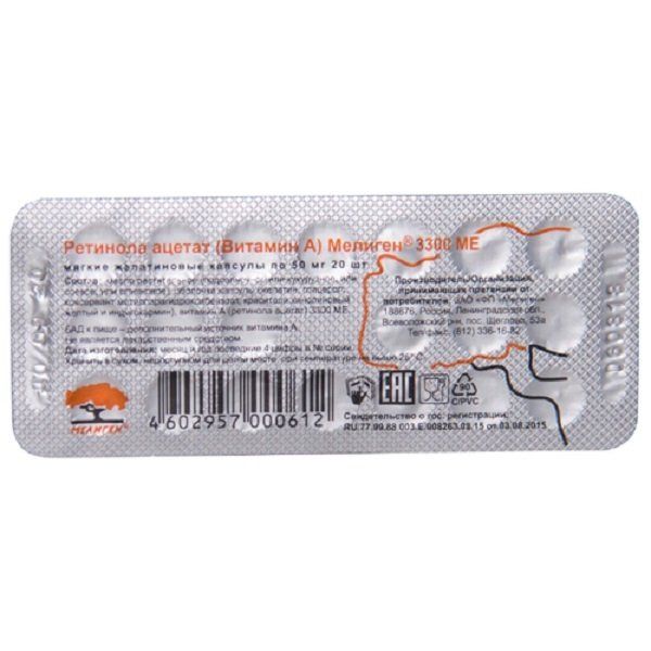 Ретинола ацетат Мелиген капсулы 3300МЕ 50мг 20шт