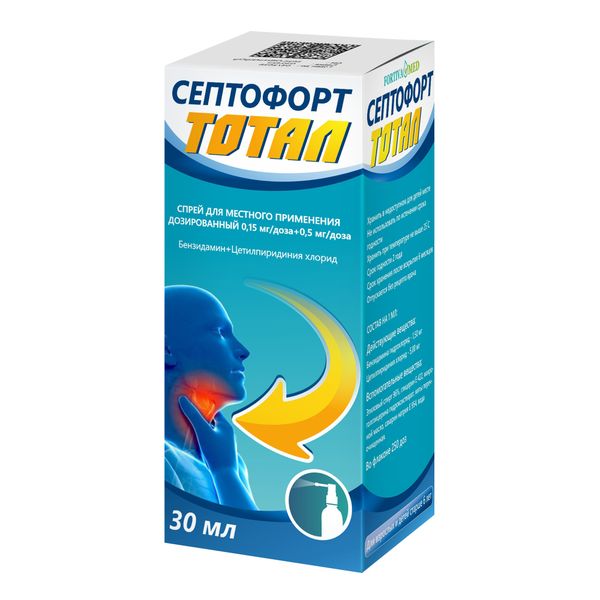 Септофорт Тотал спрей для для местного применения дозированный 0,15мг/доза+0,5мг/доза 30мл