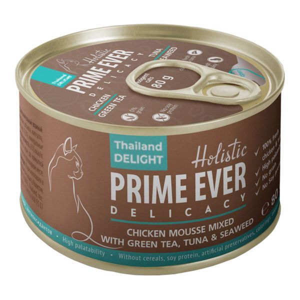Корм влажный для кошек цыпленок с тунцом с зеленым чаем и водорослями мусс Delicacy Prime Ever 3A жестяная банка 80г